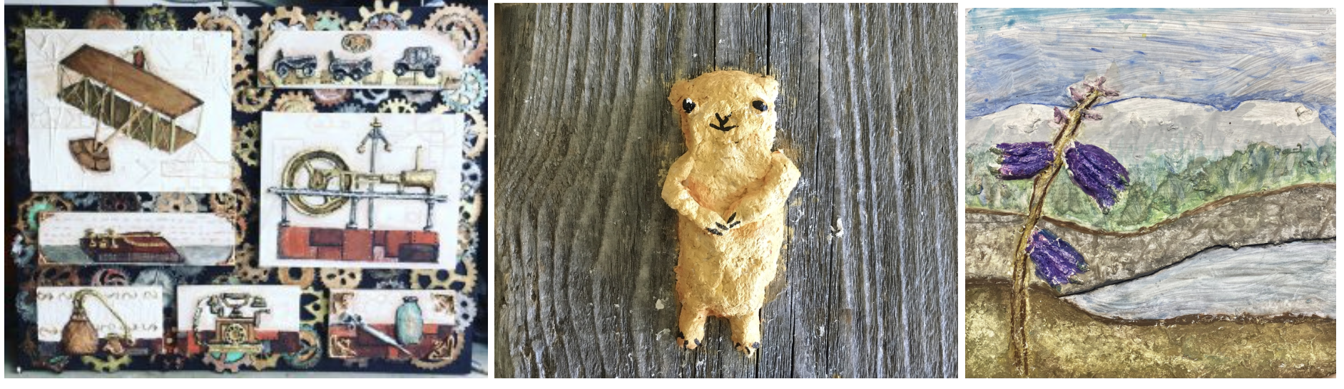 Relief sculpture is the fusion of painting and sculpting. Like a painting, a relief sculpture is designed to hang on a wall, yet elements of it are sculpted and come forward from the base. Materials include papier-mache, clay, plaster, and found objects.